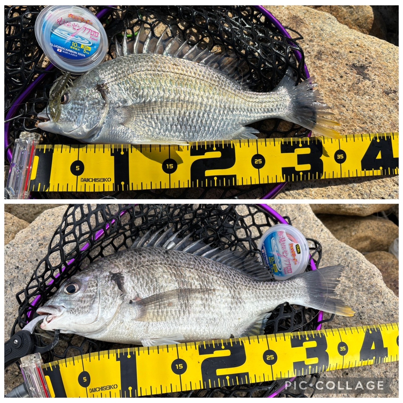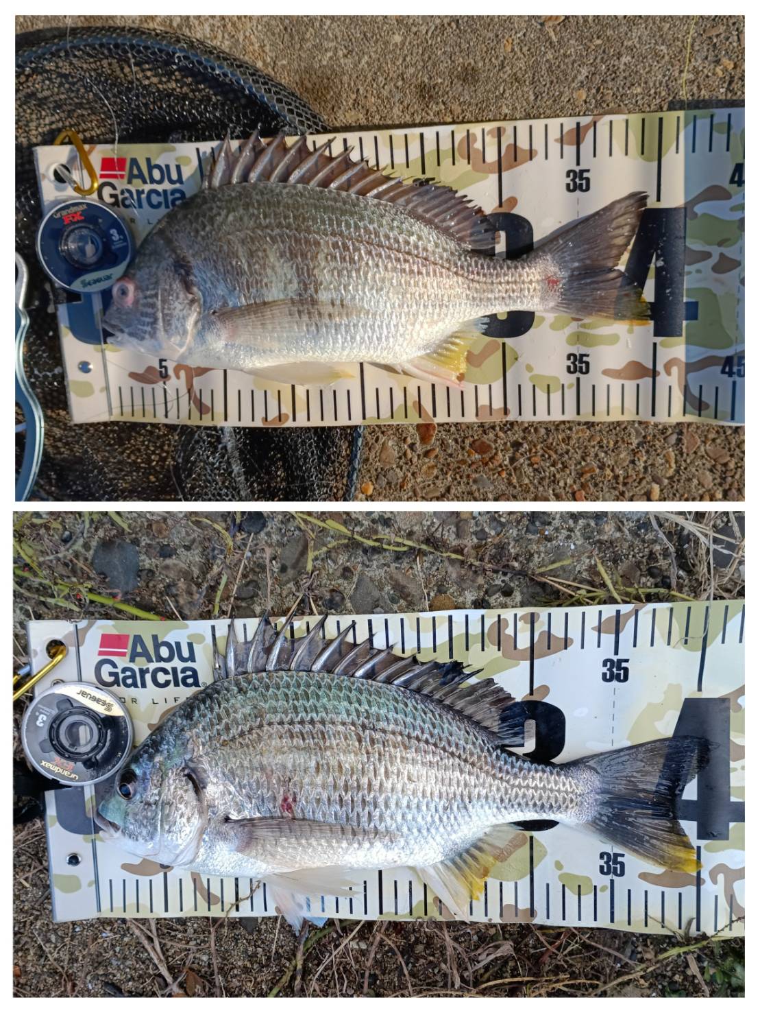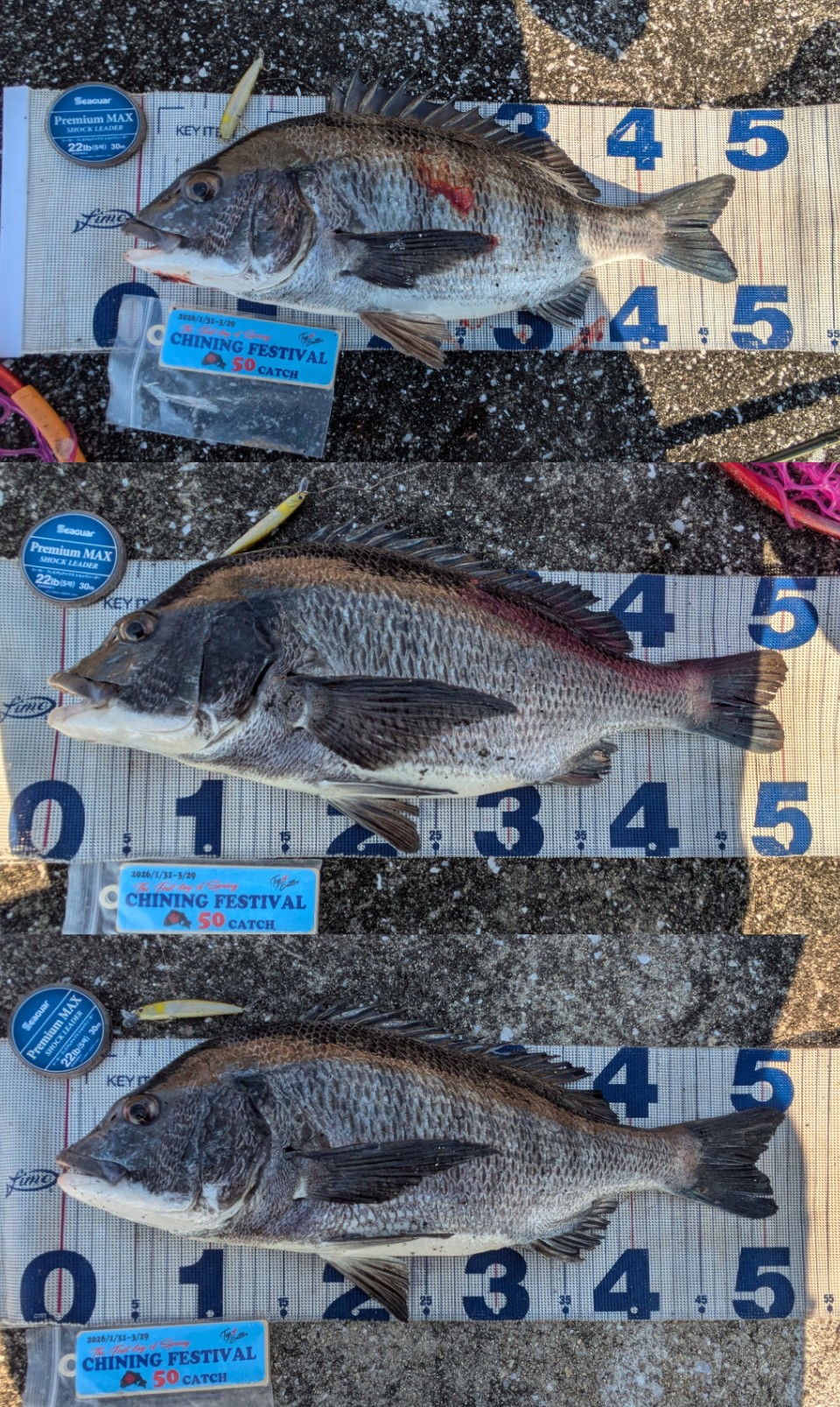 チヌの頭を左側に置いてメジャーがピンと貼っている写真でなおかつ、撮影アイテムが鮮明に映っている写真3枚(3匹)もしくは4枚(4匹)をアップお願いします。